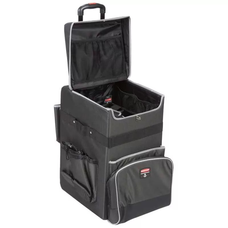 Rubbermaid Quick Cart (Large) kompakter Hotelwagen in großer Größe. Dank seiner kompakten Größe ist er auch ideal für kleine Räume, in denen große Hotelwagen nicht passen. Maße: 41,9 x 36,3 x 63,2 cm. Gewicht: nur 7,8 kg. Tragkraft: max. 27,2 kg. Dank ergonomischer Lasche und leiser Räder ist er leicht zu bewegen. Mit großen, verstaubaren Taschen. Material: wasser-, öl- und schmutzabweisend. Die Innenverkleidung ist herausnehmbar und waschbar. Empfohlene Verwendung: als Housekeeping-Wagen, Wartungs-/Hausmeisterwagen.