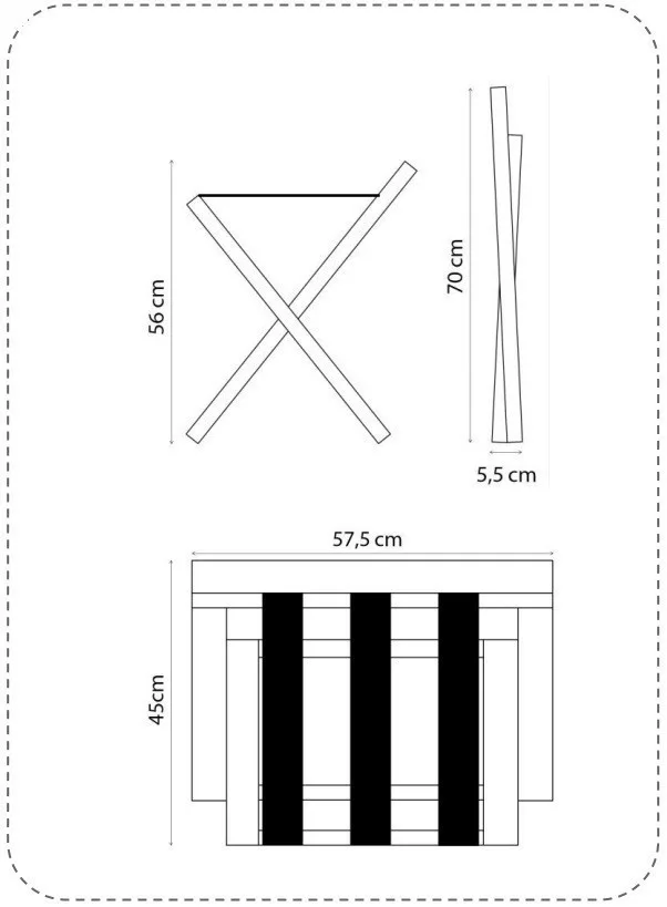- Maße: Breite: 57,5 ​​cm, Länge: 45 cm, Höhe: 56 cm (zusammengeklappt: Breite: 57,5 ​​cm, Länge: 5,5 cm, Höhe: 70 cm)