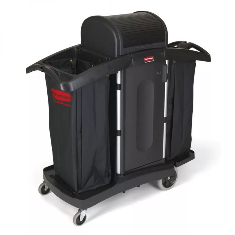 Großer Housekeeping-Hotelwagen von Rubbermaid mit 2 Taschen. Abschließbare Ablagen mit Packflächen oben und in der Mitte. Farbe: Schwarz. Größe: 131,4 x 55,8 x 135,9 cm. Material: strapazierfähiges Polypropylen und Aluminium. Taschenmaterial: wasserdichtes PVC – 2 Stück. Beidseitig schiebbar, mit benutzerfreundlichen ergonomischen Griffen.
