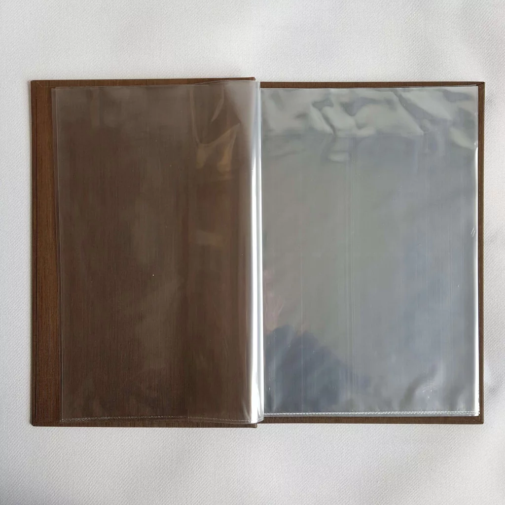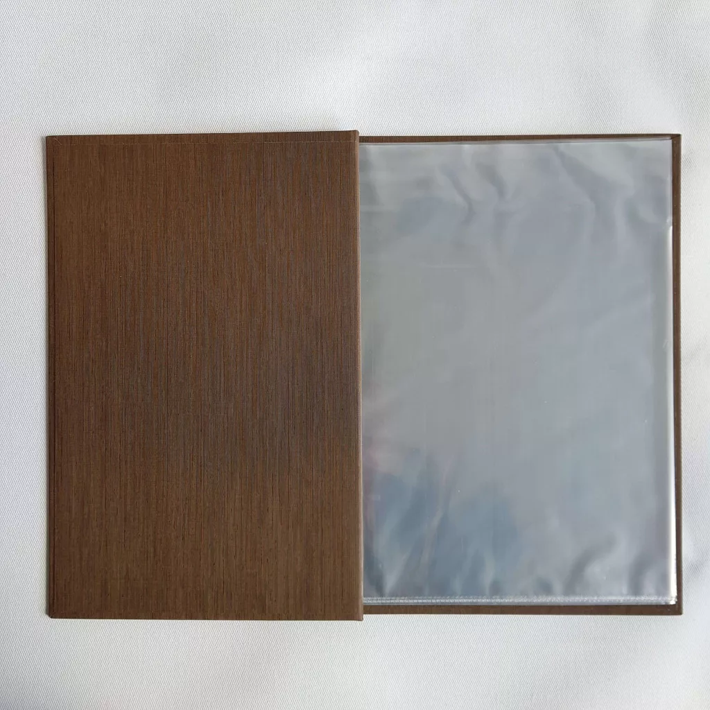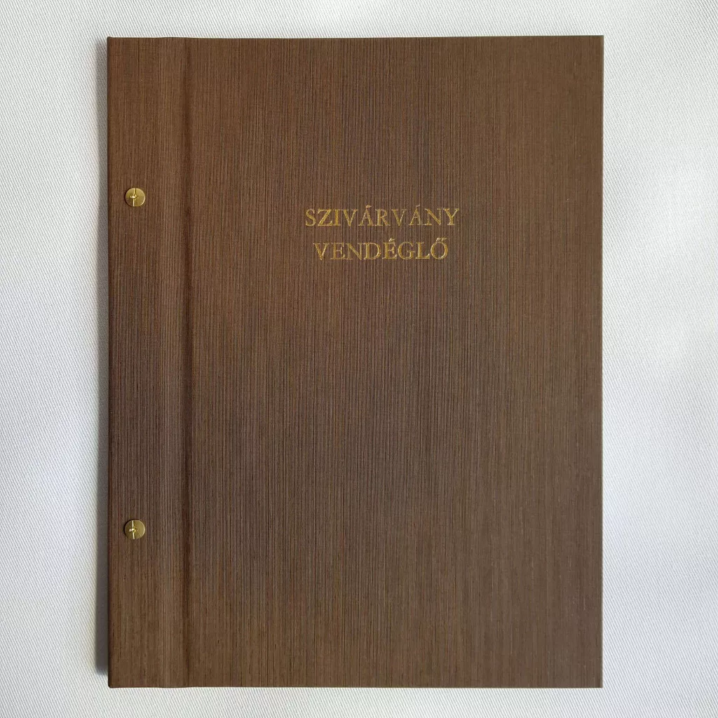 Csavaros étlaptartó sötétbarna textilbőr, logónyomással, 8 darab fóliával, A4 méret