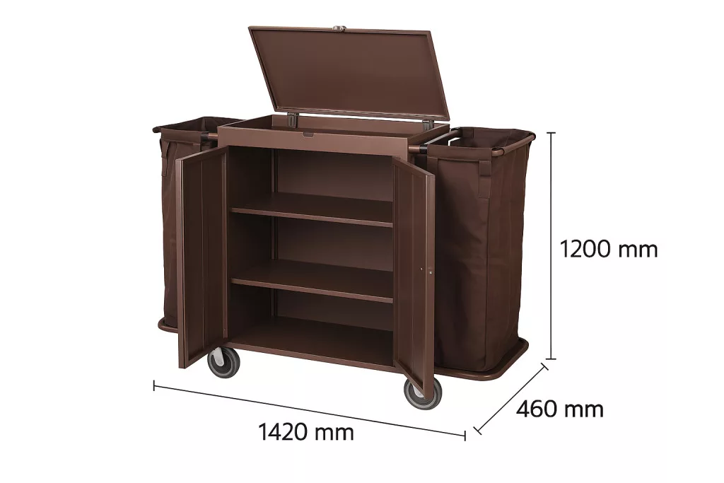 Der Room Maid Trolley ist eine praktische und funktionale Lösung und ideal für Haushalte, Hotels und andere Gastronomiebetriebe. Die Metallkonstruktion sorgt für Langlebigkeit und Stabilität, während die Pulverbeschichtung die Außenseite vor Abnutzung und Beschädigungen schützt. Der Trolley verfügt über drei Türablagen, die eine übersichtliche Aufbewahrung verschiedener Gegenstände ermöglichen und alle benötigten Utensilien griffbereit halten. Die beiden robusten Taschen mit Multifunktionsfächern helfen dabei, kleinere Gegenstände wie Reinigungsmittel, Handtücher und andere Accessoires zu organisieren. Der Trolley ist mit 5-Zoll-Vollgummirädern ausgestattet, die eine einfache Mobilität gewährleisten, sodass er überall eingesetzt werden kann. Seine Abmessungen von 1420 x 460 x 1200 mm bieten ausreichend Stauraum, ohne viel Platz einzunehmen. Die Lieferzeit beträgt 6 Wochen. Der Room Maid Trolley ist nicht nur praktisch, sondern auch ästhetisch ansprechend und fügt sich somit in jede Umgebung ein, ob privat oder gewerblich.