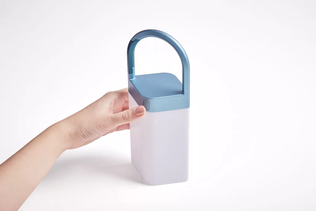 Da die Horizon Lampe ultraleicht ist und über einen Tragegriff verfügt, lässt sie sich bequem transportieren. Der Griff dient auch als Haken, sodass Sie sie bequem überall aufhängen können. Mit dem Touch-Button an der Vorderseite können Sie die LED-Farbe auswählen und die Helligkeit regeln.