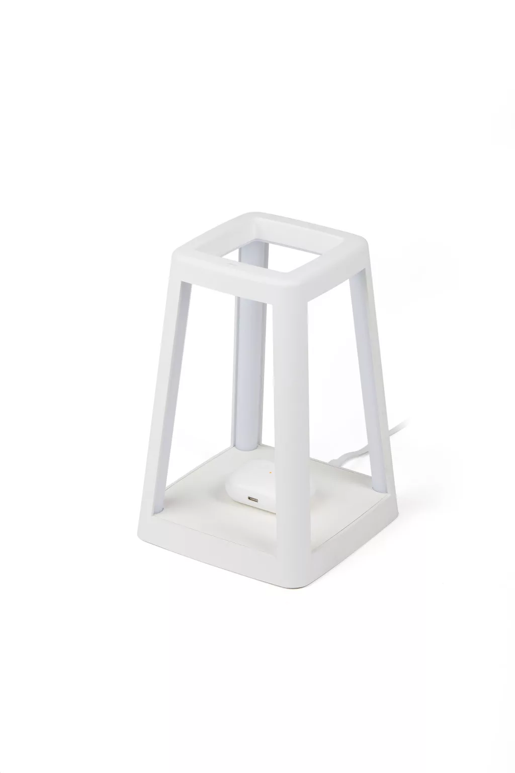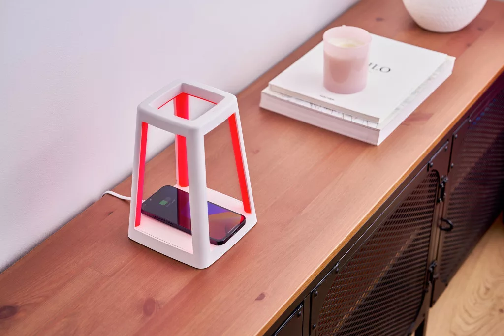 Die Laterne ist eine tragbare 2-in-1-Lampe, die farbenfrohes Licht und kabelloses Laden kombiniert. Die mit dem renommierten IF Design Award und dem Red Dot Design Award ausgezeichnete Laterne besticht durch ihr ästhetisches Design. Sie bietet eine komplett offene Struktur mit integrierten LEDs an den Beinen und einem kabellosen 15-W-Ladegerät an der Unterseite.