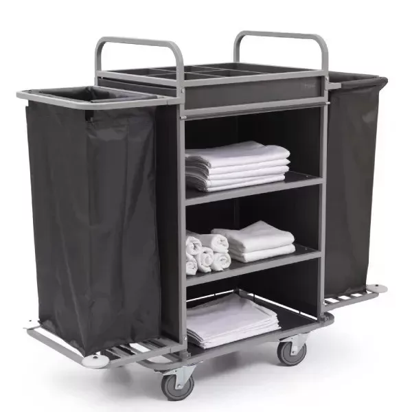 Hochwertiger, grau lackierter Dienstmädchenwagen mit Metallrahmen. 3 stabile Holzböden, eine schwarze, zusammenklappbare Stofftasche, Wandhalter und ein oberes Ablagefach. 2 bremsbare Räder, 2 Planetenräder. Maße: Breite: 58 cm, Höhe: 132 cm, Länge geöffnet: 147 cm.