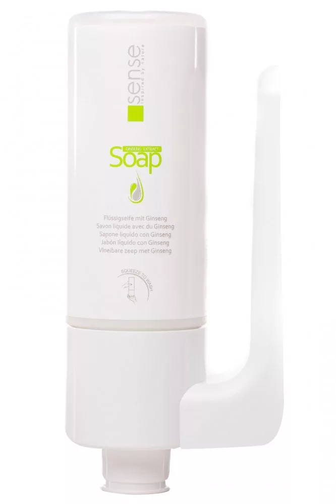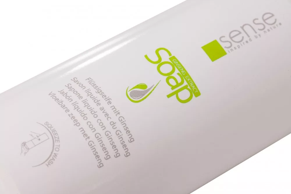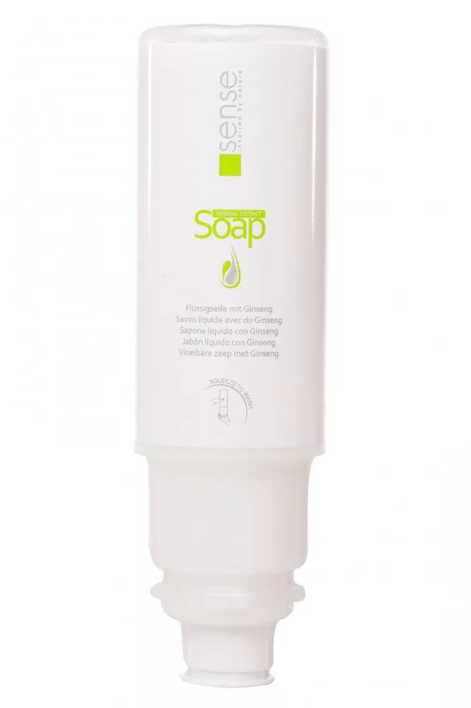 Flüssigseife mit Ginseng-Duft für Hotels. Die Flüssigseife Sense in klassisch-eleganter Optik mit entspannendem Ginseng-Aroma ist eine praktische und moderne Lösung für Hotels und Gastronomiebetriebe.