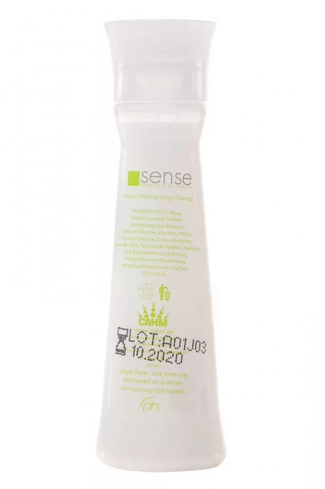 Die 25-ml-Flasche des Sense Shampoos ist die ideale Wahl für Hotels, die Wert auf Sauberkeit und Schlichtheit legen. Mit seinem dezenten und angenehmen Duft nach Jasmin und Orange sorgt das Shampoo nicht nur für ein frisches Gefühl, sondern trägt auch zur Erhaltung des pH-Werts der Haut bei. Es ist auch für Gäste mit empfindlicher Haut geeignet und bietet ihnen so ein sanftes und wohltuendes Pflegeerlebnis. Die harmonische Farbgebung in Weiß und Grün strahlt Reinheit und Frische aus und macht das Shampoo zur perfekten Ergänzung für jedes Hotelbadezimmer. Da das Shampoo frei von Parabenen ist, garantieren die hautfreundlichen Inhaltsstoffe eine angenehme Anwendung. Die Produktbeschreibung ist in mehreren Sprachen verfügbar und erleichtert so die Anwendung für Gäste aus anderen Ländern. Das Produkt wird gemäß den EU-Richtlinien und -Vorschriften hergestellt und erfüllt somit höchste Qualitätsstandards. Sense Shampoo ist mehr als nur ein Hygieneprodukt – es ist ein Erlebnis, das dem Komfort und Wohlbefinden der Gäste dient und gleichzeitig die Umwelt schont. Während der Anwendung wird die Haut weicher und mit Feuchtigkeit versorgt, sodass die Gäste mit ihrer Wahl garantiert zufrieden sein werden. Die Verpackung des Shampoos ist praktisch, leicht zu verstauen und ideal für Reisen. So genießen Ihre Gäste jederzeit Frische und Sauberkeit – ob zu Hause oder unterwegs. Sense Shampoo legt nicht nur Wert auf Hautpflege, sondern auch auf Umweltschutz und wurde daher im Sinne nachhaltiger Entwicklung hergestellt.