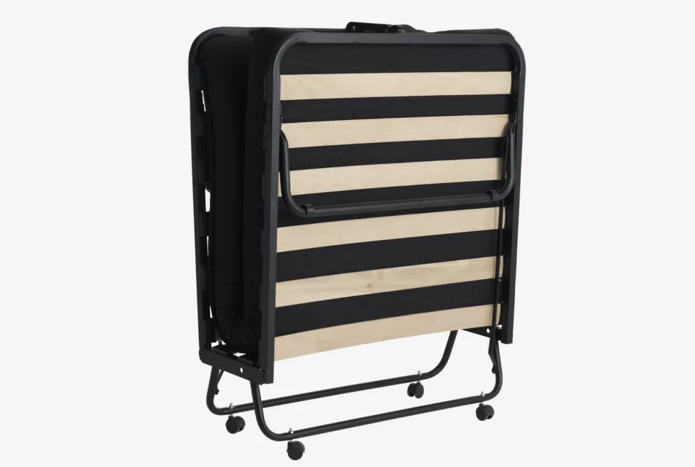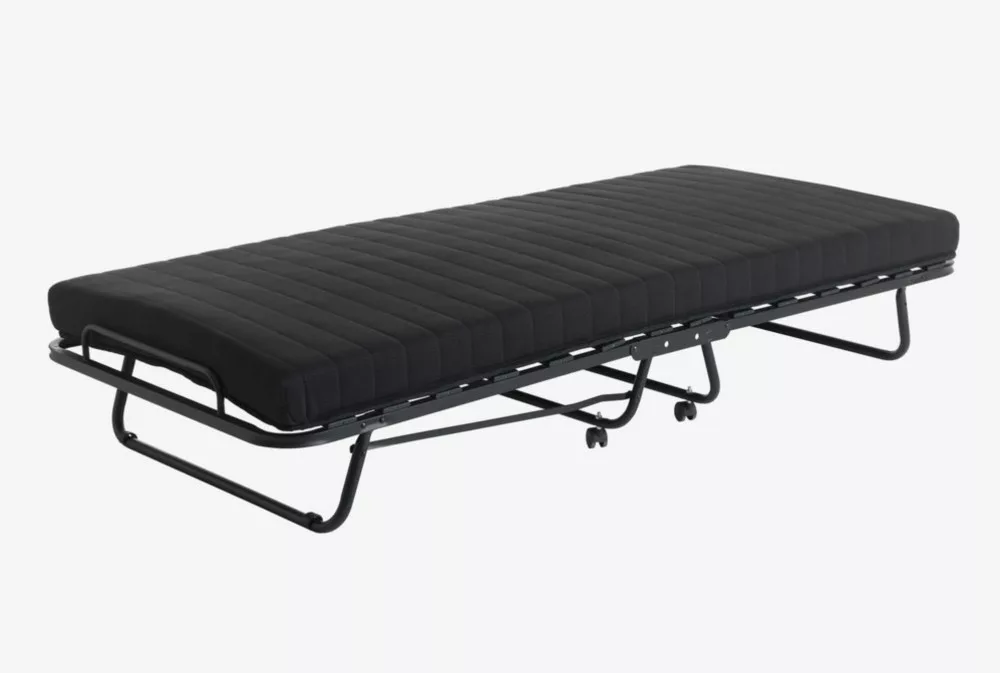 Stahl. Mit einer 11 cm dicken Matratze, deren Kern aus druckausgleichendem Memory Foam und Polyetherschaum besteht. Bettrahmen aus Holz. Klappbar. B90 x H200 x T38 cm