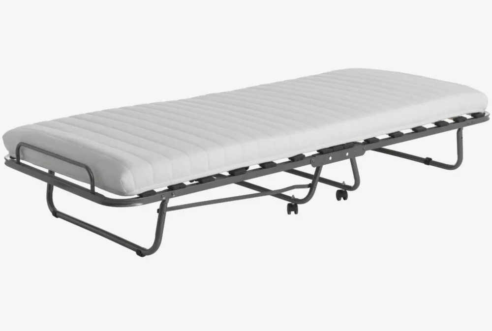 Stahl. Mit einer 9 cm dicken Polyätherschaum-Matratze, die zusätzlich eine Memory-Schaum-Schicht mit druckausgleichender Wirkung enthält. Bettrahmen aus Holz. Klappbar. B80 x H200 x T36 cm