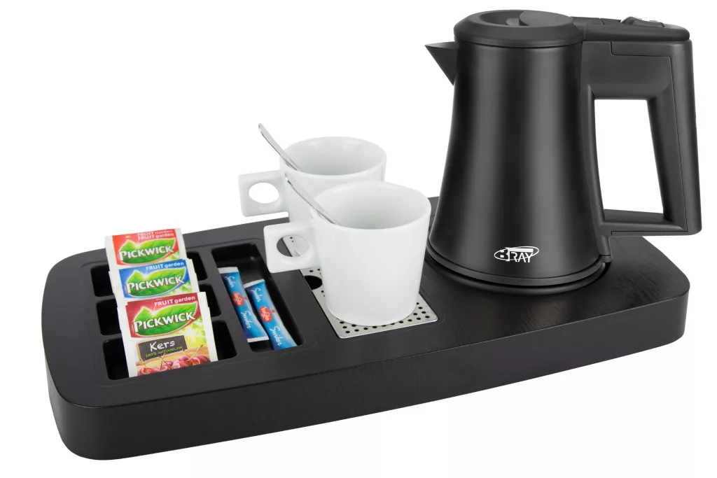 Sense tálca 0,5L-es fekete vízforralóval és 2 fehér csészével