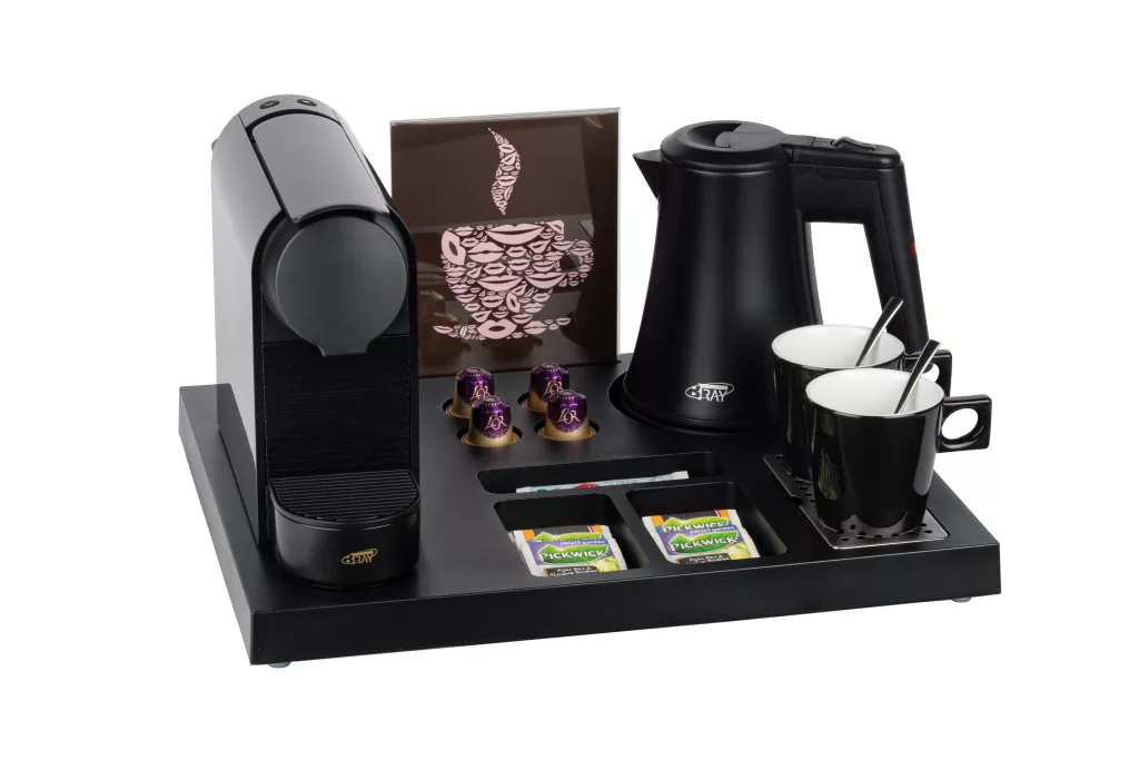 Siesta tálca 0,5L-es fekete vízforralóval és 2 fekete csészével