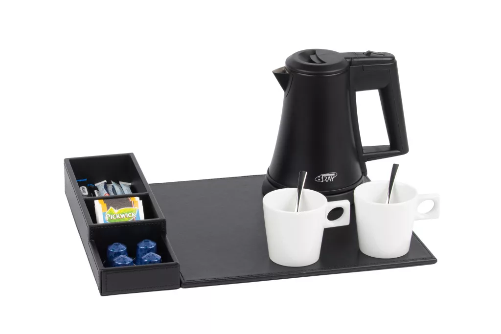 Snap tálca 0,5L-es fekete vízforralóval és 2 fehér csészével