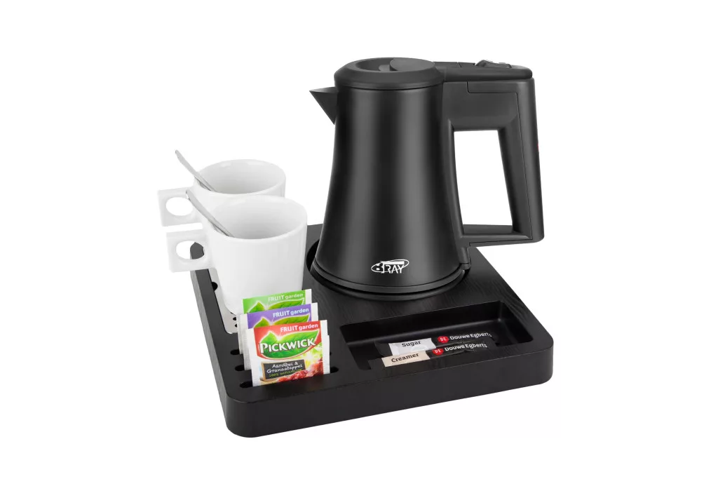 Square tálca 0,5L-es fekete vízforralóval és 2 fehér csészével